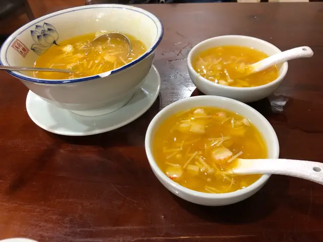 湯方面我地揀左飲金湯海皇翅。 侍應一窩咁呈上黎,個份量真係多到令人驚訝。 金湯入面既橙黃色主要係源自南瓜,再佐以金菇, 粉絲,蟹柳等等既配料,飲落鮮甜可口,再點醋飲風味尤佳。