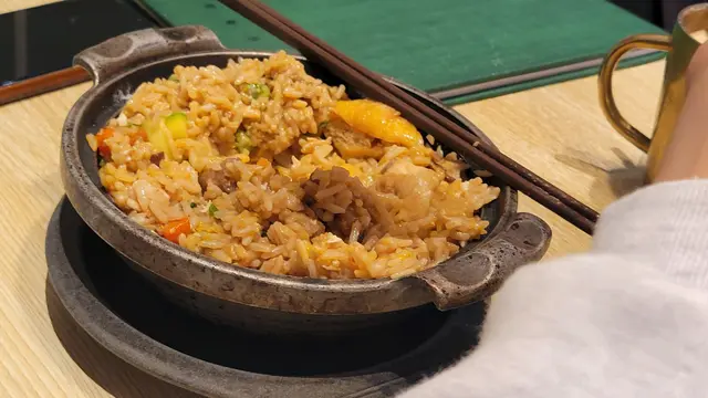 我們全叫了午餐,窩蛋牛肉燜飯來到時我同學說無甚麼餸,但這個是一個粉飯底用了一個煲仔的形式去做一個飯,我也試了一下樣子看試去都似煲仔飯的顏色和色澤,食下去也很難怪她說沒有甚麼配料,只是單單的豉油味道,不過她的飯確實有一些配料在的,我見到牛肉,還有蕃茄還有一個窩蛋。
