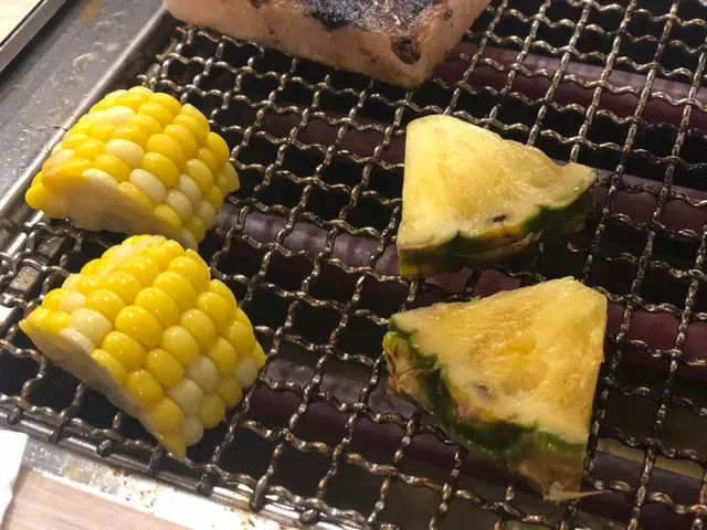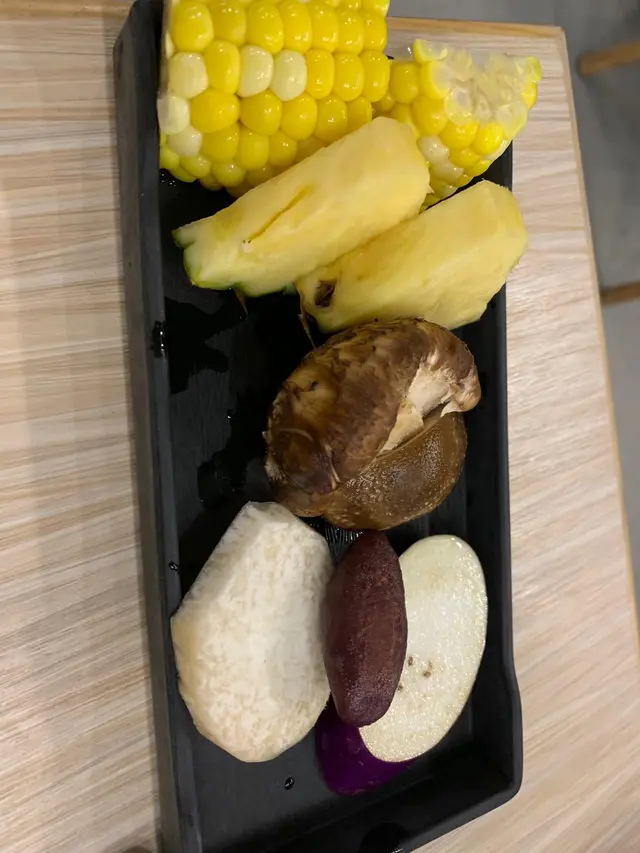 蔬菜方面選擇都合理(洋蔥、雞脾菇、三色椒、南瓜.....),我地燒咗菠蘿、甜薯、栗米、茄子、菇。菠蘿、甜薯、栗米都甜。菇燒完後,軟淋淋,咬起來都有汁,加少少海鹽食覺得幾好味。