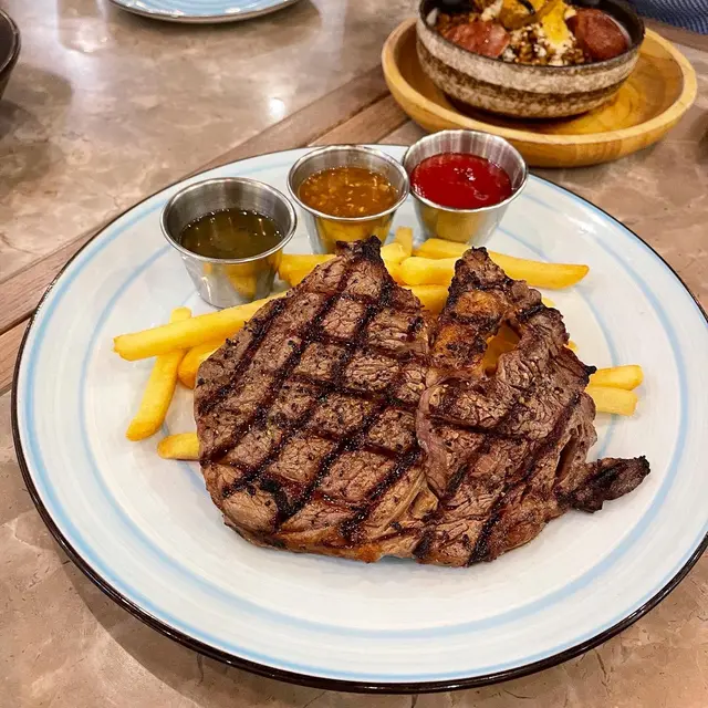 8安士肉眼扒比想像中大,燒得好香,叫了5成熟,又嫩又好味,另上蘑菇燒汁醬同阿根廷青醬,我就覺得唔蘸都已經好夠味,再配埋炸薯條,好夠飽