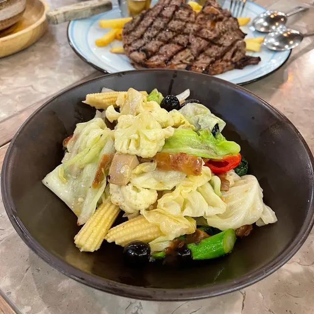 雜菜加上辣肉腸一齊炒,好夠味,但好油,每一舊菜都有層油包住的,放耐左仲油膩
