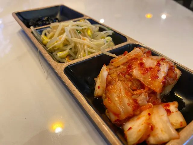 首先店員送上前菜:黑豆、芽菜、泡菜,味道很地道,尤其黑豆,味道帶甜,很追吃。