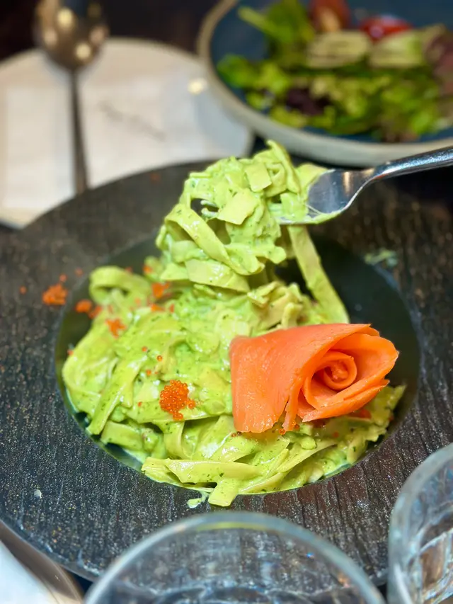 🫧煙三文魚闊條麵配波菜忌廉汁🍝|田園沙律🥗|海鹽Kiri芝土奶蓋桂花烏龍🍹