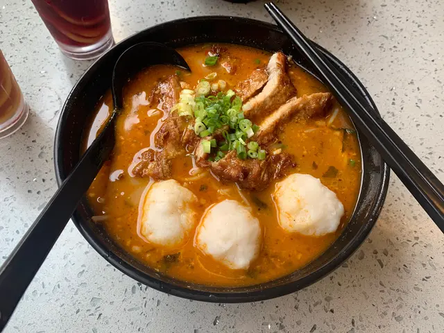 朋友叫咗香茅豬扒配花枝丸酸辣米線,小辣,佢覺得豬扒好入味,花枝丸都不錯,湯底係小辣啱啱好