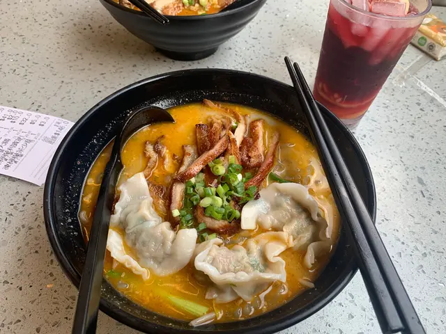 而我就選咗豬頸肉配韭菜雲吞麻辣薯粉,因為我怕食辣會肚痛,所以揀左微辣,雲吞好多餡,幾好食,比左好多豬頸肉,食落又唔乾,微微燒焦入口好香,薯粉都幾夠冧