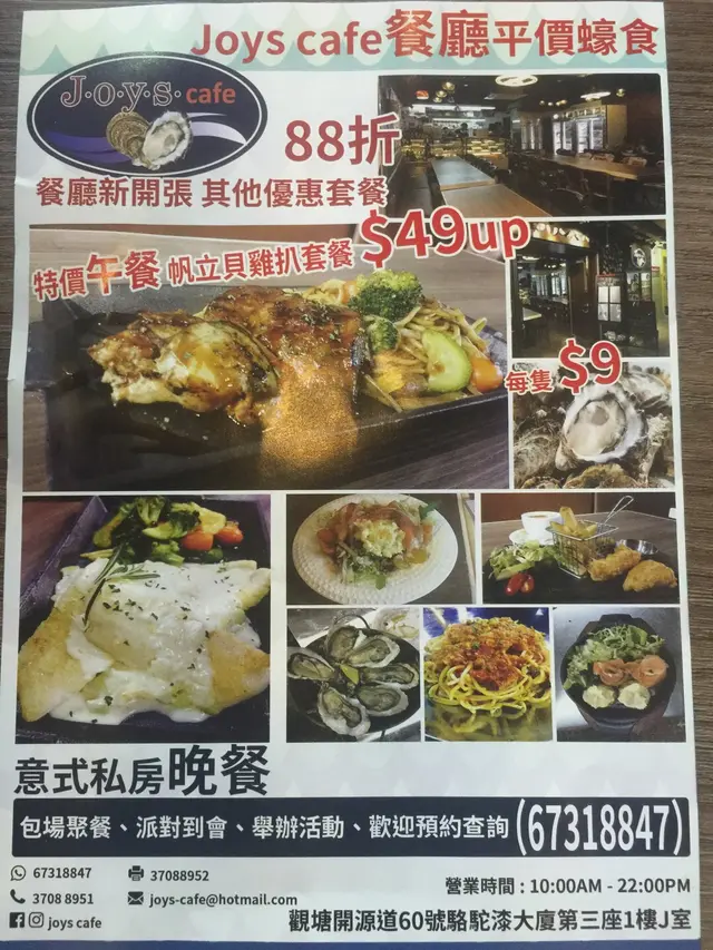好好味,又抵食,服務態度一流,環境舒適 WuPurpleLevel 12016-10-25242 views Follow 第一次黎食,海鮮拼盤$78好抵食,送埋野飲,d刺身同埋生蠔好新鮮,蜜糖雞翼好香好入味,牛扒都好好味,d菜式幾有心思!新開張,值得推薦!服務態度非常好,下次一定會再來!$150The above review is the personal opinion of a user which does not represent OpenRice's point of view.LikeShare好好味,又抵食,服務態度一流,環境舒適 Joys Cafe https://s.openrice.com/QrKT0bhee00Report hotsang.fung 打手呀?2016-11-12 Reply mikojoyful 直頭係啦…個個食評都彈得佢讚2016-11-13 Reply LauHY 事實勝於雄辯 食過呢間**都知中晒伏根本間舖頭開門就係全心詐騙 繼多打手都唔會有用等執笠啦 *2016-11-14 Reply Post Ratings5Taste5Decor5Service5Hygiene5ValueDate of Visit2016-10-25Waiting Time5 Minutes (Dine In)Spending Per Head$150