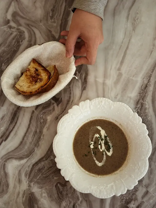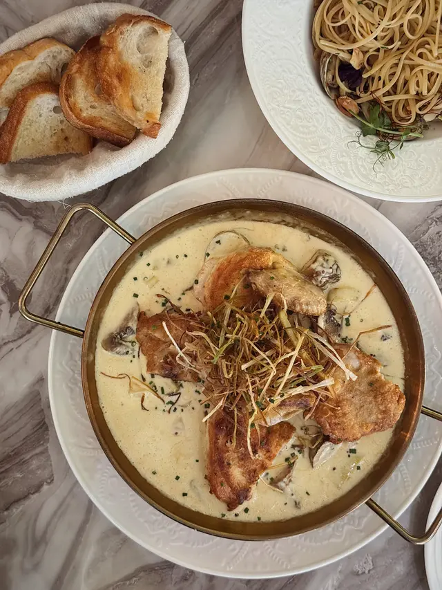在鴨胸跟烤雞之間選了烤雞~哇 我很喜歡這個Main!٩(๑❛ᴗ❛๑)۶ 烤雞浸在濃郁忌廉裡 伴隨薯仔、磨菇、洋蔥等配菜 整體非常creamy!烤雞肉質鮮嫩~另外伴隨忌廉烤雞 還會一籃4片麵包可以沾上忌廉吃 麵包非常油但非常好吃🥹 我一個人吃了3片 (還未計餐前的那片😂)