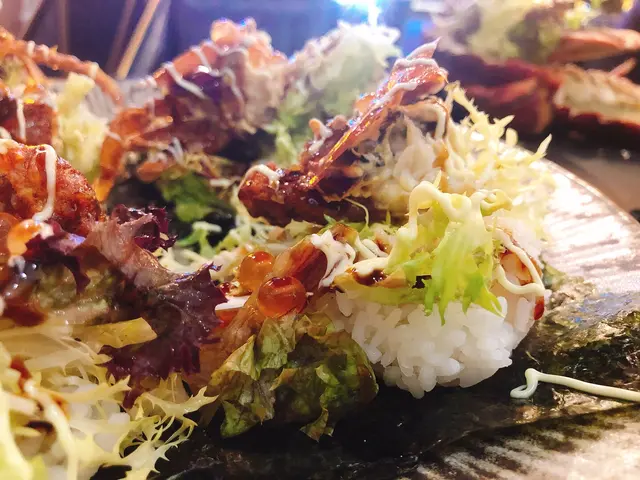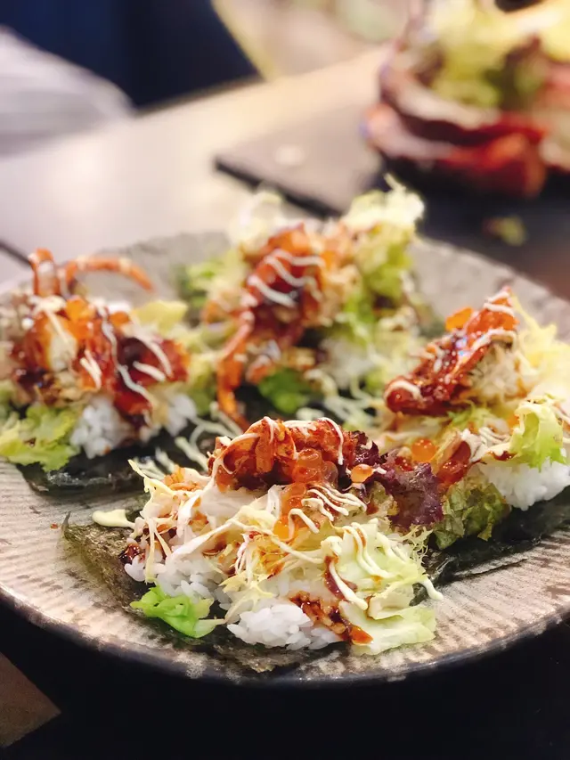 紫菜上放了壽司飯、沙律菜、三文魚籽和軟殼蟹,很多材料,想一口吃完其實不大可能,吃的時候要不顧儀態和食相。口感和味道都相當豐富,軟殼蟹的香脆、三文魚籽的鮮甜、沙律菜的清新,還有兩種醬汁組成一個極豐富的手卷,必試👍🏻👍🏻👍🏻👍🏻