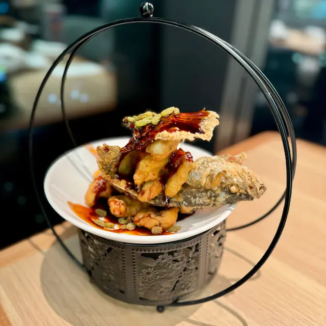 原條炸魚上,餐廳好細心地起晒肉,食起來唔怕論盡。鱸魚外脆內嫩,黑醋汁調味剛好,有驚喜!