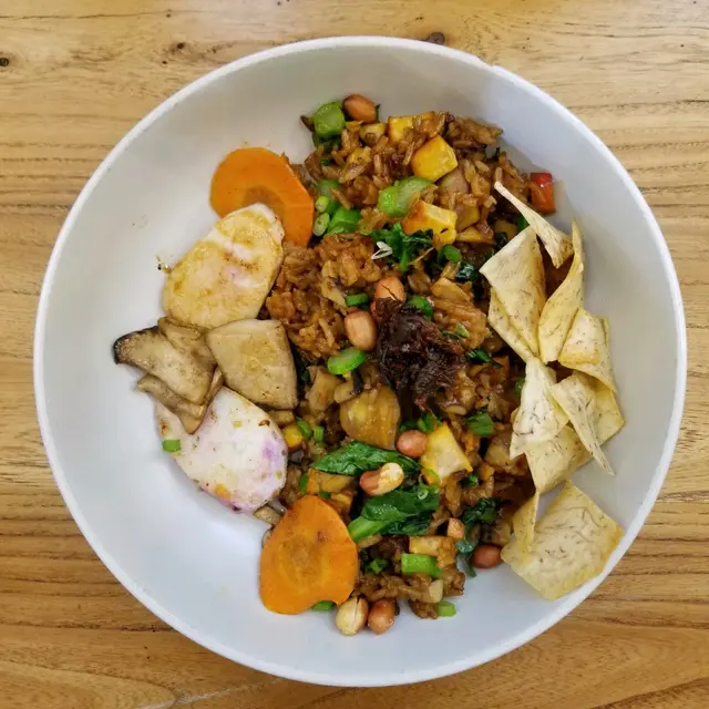 先嚟,素糯米飯,好足料,原來無臘味嘅炒糯米飯都可以好惹味,佢地加咗XO醬,辣辣地好醒胃,仲有啲炸芋頭片,雞脾菇,淮山伴碟,令到個飯好有口感。