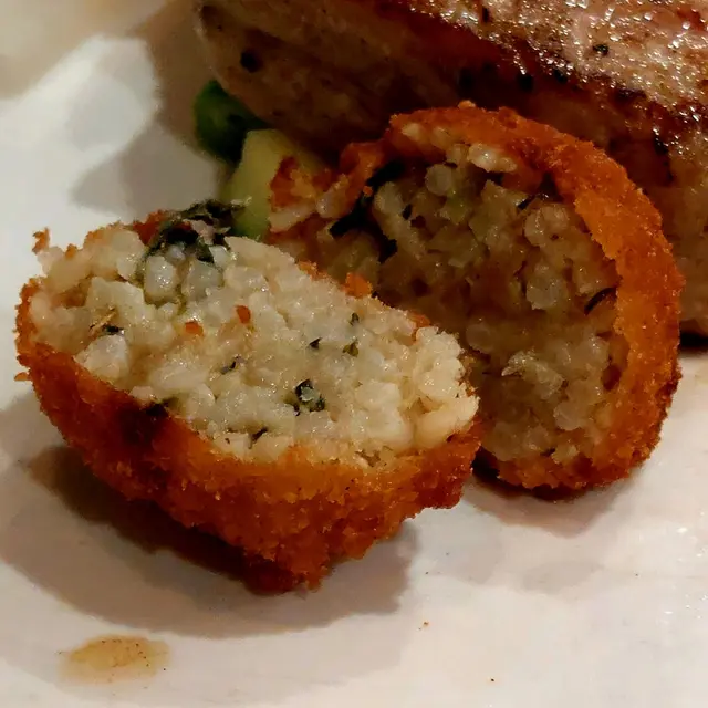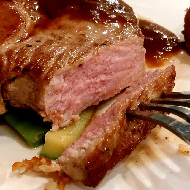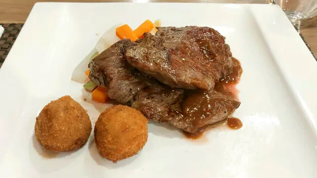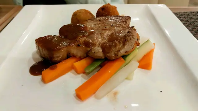 “慢煮西班牙黑豚扒”,你看,跟前面的牛扒是不是同一個模樣呢!?🤭 味道還可以。至於那兩粒炸的東西,在這盤中的位置明顯,以為是主菜一部份,但味道一般,像在快餐店吃飯一樣(但它應該是蕃薯波波)。