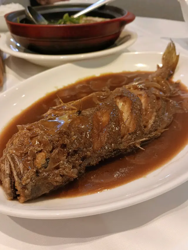 先炸後煎再醬汁燜煮, 工序繁複非常入味, 外脆內軟, 又不失黃花魚的新鮮幼滑肉質口感!