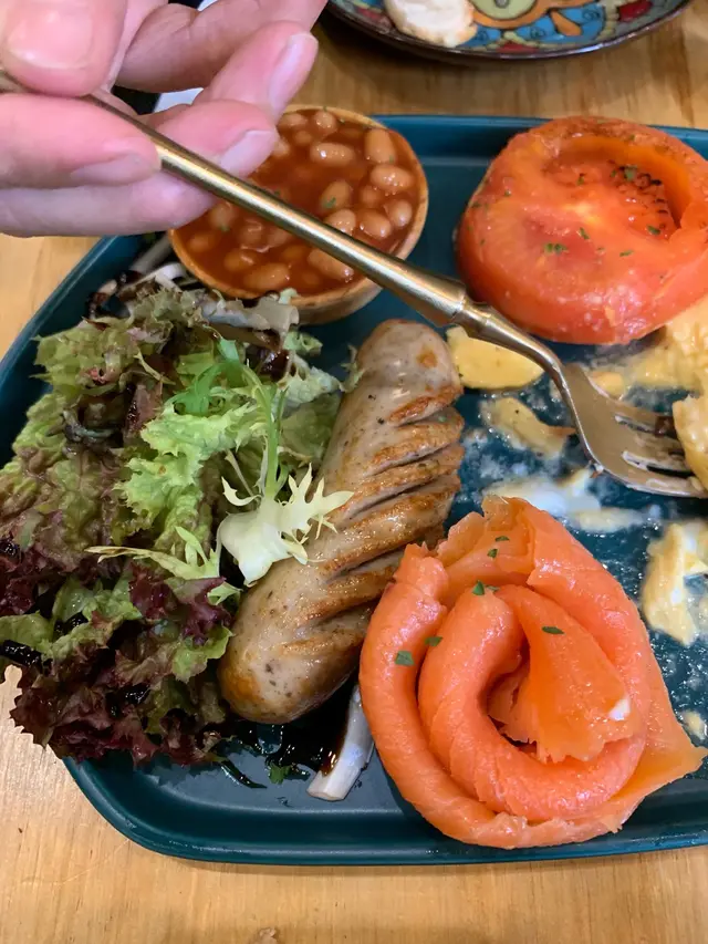 英式早餐 - 先食左蔬菜都尚算新鮮,多士有一邊烤燶左,炒蛋算滑但無蛋味,無落鹽淡都極致!菇重有少少炒燶⋯⋯茄汁焗豆竟然系凍既!