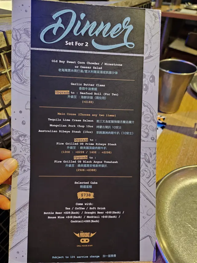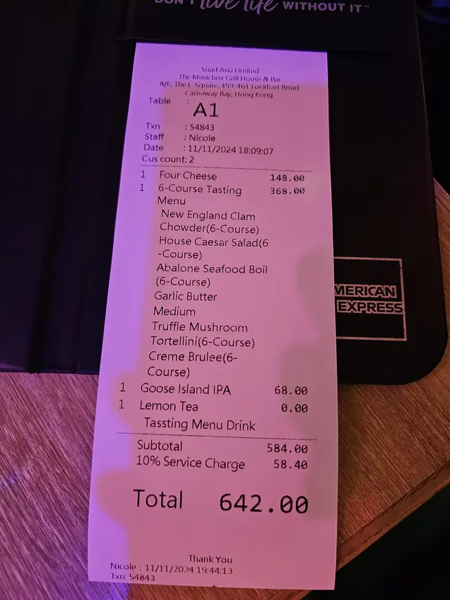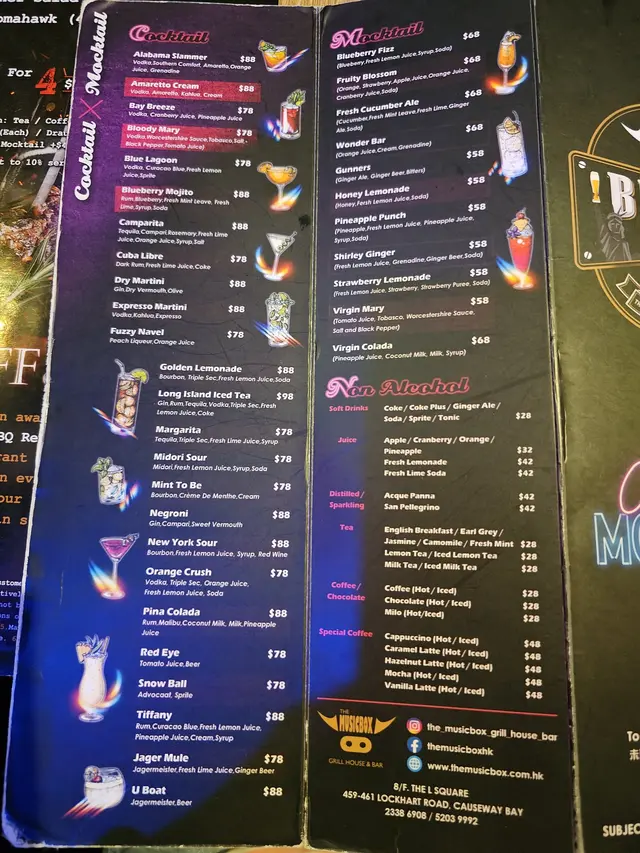 The Musicbox Grill House & Bar 位於銅鑼灣地鐵站附近, 交通十分便利, 吸引之處是餐廳以音樂作主題, 場內設有打碟機及專業音響設備, 餐廳牆上裝飾亦以懷舊黑膠唱片作擺設, 播放著懷舊英文歌曲, 很有特色, 怪不得不到七點便座無虛設, 不想等位最好還是預約。