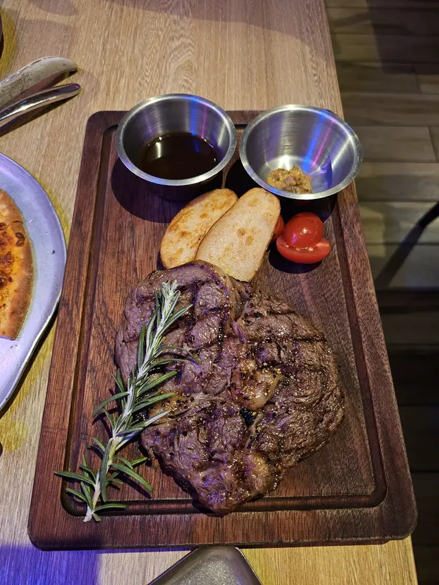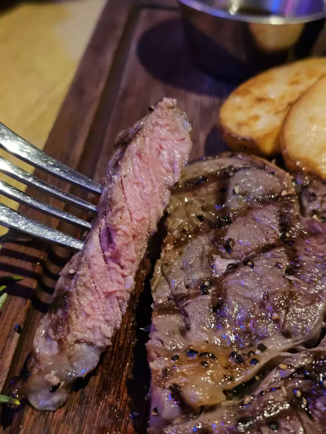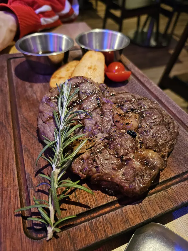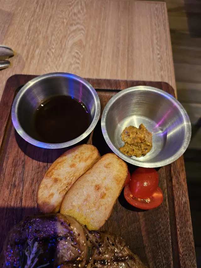 叫了5成熟, 同時要求切開牛扒不要見血水, 餐廳非常好, 廚師煎好牛扒後等待收完血才上枱, 牛扒切開, 還呈現嫩紅的肉色, 沒有血水滲出, 剛剛熟, 入口牛味濃郁, 肉汁豐富, 口感柔嫩, 有著bbq炭燒的焦香香氣, 跟帶點肥肉一齊食, 那股煎焦了的牛油甘香, 好吃得很, 牛扒煎好後本身廚師已磨了少許海鹽及黑胡椒提鮮, 基本上我們沒有拈附送的燒汁及芥末醬吃, 只試了一小塊拈少許芥末醬, 味道有芥末的刺激香辣, 還是原味牛扒更好食。