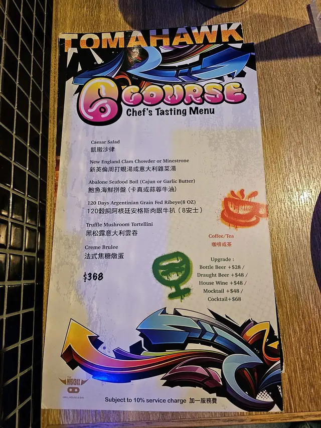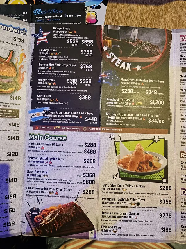 食物方面以西餐為主; 前菜沙律、小食、牛扒、薄餅、羊扒、意粉及甜品等, 當然少不了酒吧的不同酒精飲品。