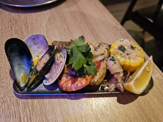 拼盤內有鮮味爽彈飽魚、爽脆原隻八爪魚、原肥美花甲、爽口大蝦、青口及意大利腸, 蒜蓉牛油汁惹味香得黎又不搶海鮮的鮮甜
