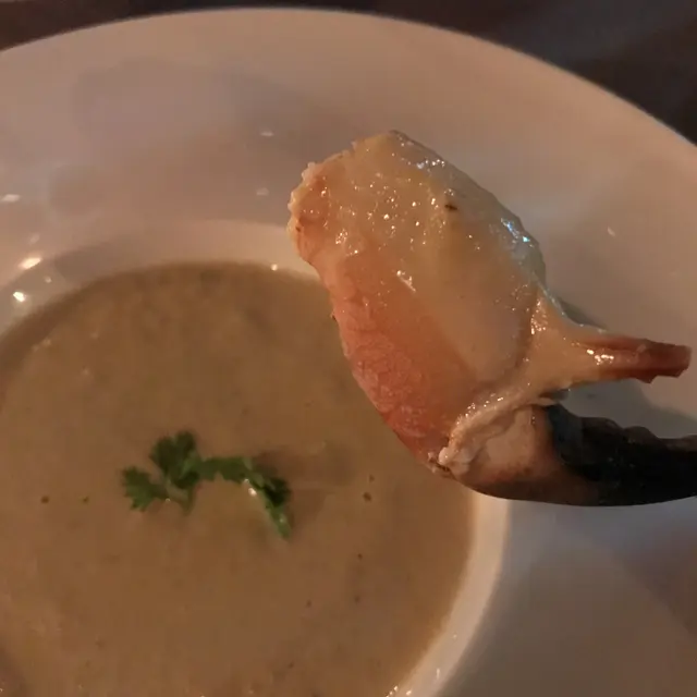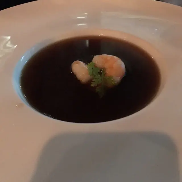 法式鮮蝦清湯:上枱時店員才會把湯倒到碗中,湯屬清湯,味道像龍蝦湯的鹹香