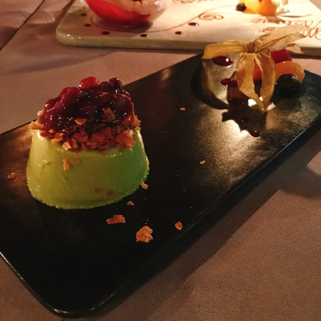 櫻桃乳酪芝士慕絲配金巴利啫喱:因為是慶生,所以有請餐廳在碟上寫上Happy Birthday