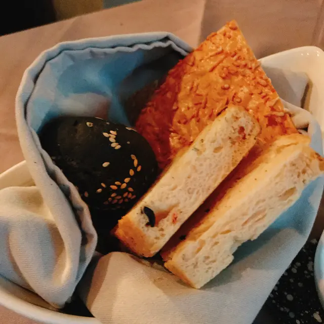自家製麵包:吃完生蠔,正式開始晚餐。這是餐廳自家製麵包,有3款:芝麻墨汁包、香草包和芝士脆片。麵包不只又暖又香又軟熟,還配上了自家製的香草茄子醬和辣肉腸南瓜醬,前者香中帶微辣,後者甜中帶肉香,2款都很好味