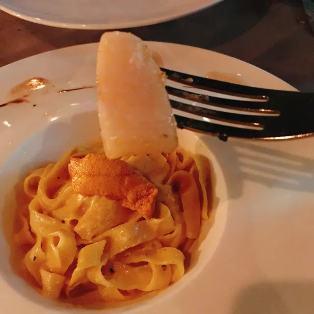 香煎北海道帶子配海膽忌廉意大利寬麵:帶子只是微微煎過,表面很香,而入面還保留刺身的質感,很滑
