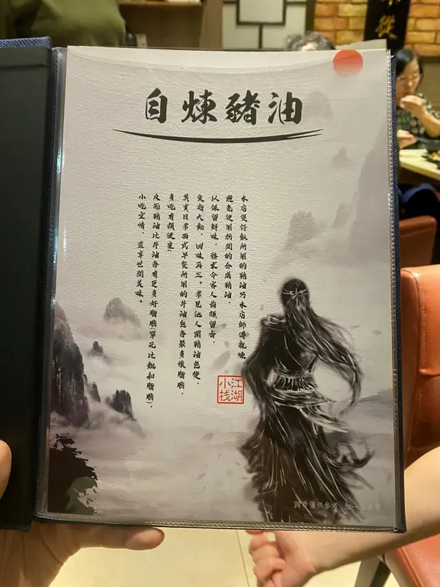 江湖小棧店如其名,入邊嘅裝修好有武俠小說嘅感覺,好似客棧,連餐牌都係武林秘笈、英雄帖,每一本Menu各方面都唔同,我呢一本係玄冥神掌,確實有江湖嘅味道。