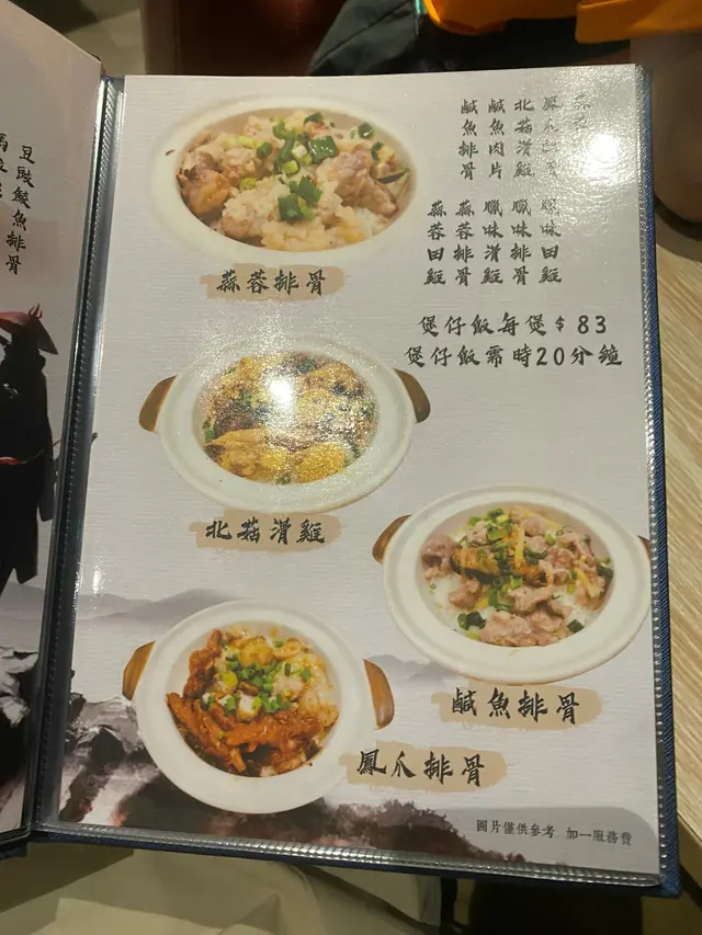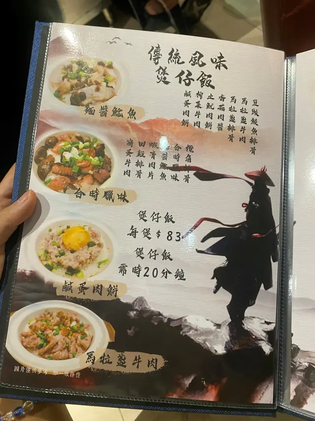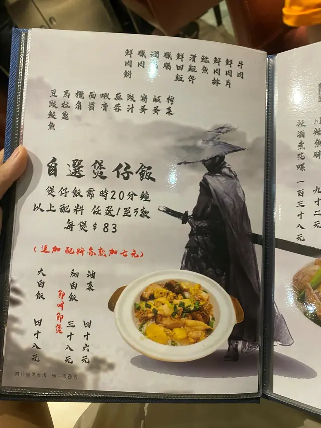 睇過「玄冥神掌」,餐廳主打即叫即做既煲仔飯,款式多達23種,全部都係$83一煲,除咗可以揀招牌口味之外,仲可以自選餸菜,最多可以揀3款餸,特別既餸好似有豆豉鯪魚、蝦膏、榨菜,好似食車仔麵咁,另外仲有煲仔菜、小菜、生滾粥、小食等等,小菜嘅款式會比起一般大排檔少。