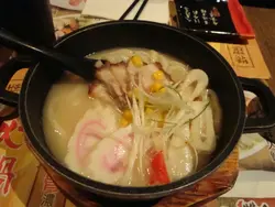 用小鍋裝著,湯底不算很濃,朋友說是粉開的(我自己就唔係好識分別),配料有獅子狗、蟹柳、嗚門卷、豚肉和粟米,豚肉很像五花腩燒肉,不過在餐牌上有圖片所以有心理準備了,味道都不錯,烏冬幾滑有咬口,最深刻是吃粟米,很甜