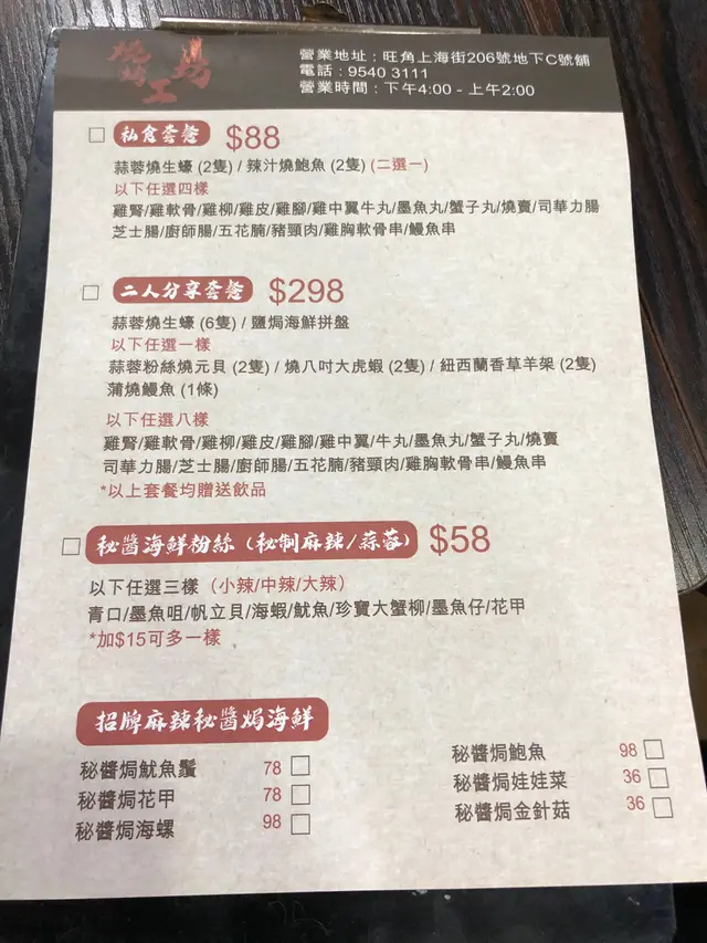 宵夜食串燒 schingchingLevel 32021-05-1318 瀏覽 關注 放工好夜,諗起附近新開咗一間串燒店!提早打電話俾老細,問可唔可以落單先,轉頭過嚟攞外賣!老細話OK!咁樣可以慳返等嘅時間😄😄放工好攰,咩都唔想諗,直接叫左兩個套餐!雖然係套餐,但亦都有嘢揀套餐一:私食套餐 $88我揀咗燒鮑魚、雞柳、雞中翼、廚師腸、豬頸肉鮑魚上面有好厚嘅蒜蓉粒啊,一啖咬落去,濃濃嘅蒜蓉味,好正🤩🤩鍾意食蒜蓉嘅你,唔可以錯過!鮑魚夠嫩口,唔韌!串燒最好食嘅永遠都係雞中翼,燒得香脆可口,少少辣,有層次!廚師腸都係🤤🤤🤤套餐二:秘醬海鮮粉絲 $58我揀咗麻辣味,返工返得咁辛苦,要食辣紓解一下!除咗粉絲以外,我仲揀咗青口、魷魚、墨魚仔墨魚仔真係成隻㗎!粉絲索上麻辣湯底,一啖粉絲一啖辣,口感豐富且刺激!以上食評乃用戶個人意見 , 並不代表OpenRice之觀點。讚好分享宵夜食串燒 燒烤工坊 https://s.openrice.com/QrKT0Tr8yW0檢舉 張貼 評分4味道4環境5服務5衛生5抵食用餐途徑TakeAway