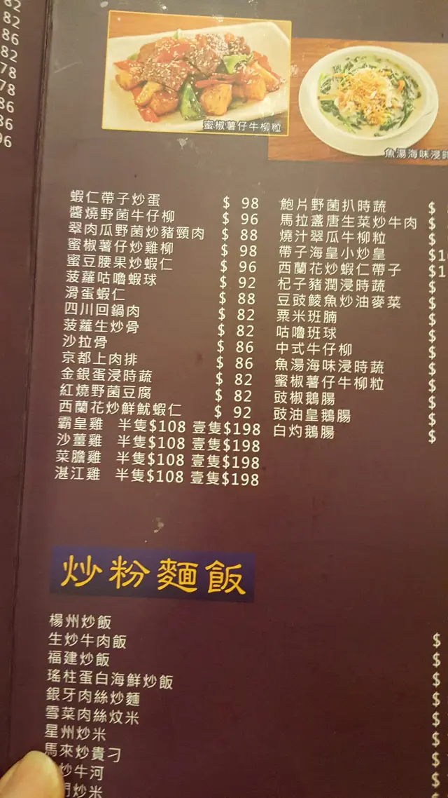 呢次我地食左沙薑雞半隻($108),蜜椒薯仔牛柳粒($98)與及西芹炒鮮魷($88)。