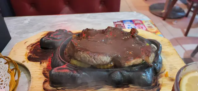 在四周看到一些牛扒的展示,還有旁邊的客人點了鐵板餐,滋滋的聲音和濃濃的白煙,看起來不錯,還聽到他們說是常客來。