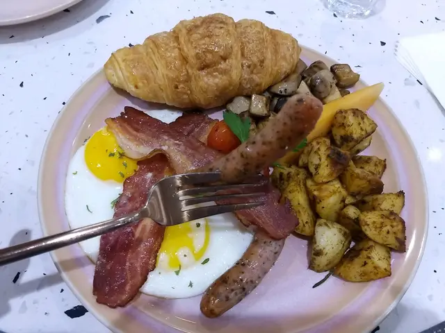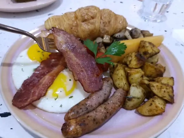 英式豐盛,有煎蛋煙肉腸仔蘑菇薯仔牛角包,煎得香,分量十足,最鍾意腸仔及煙肉,腸仔細細條味香,煙肉惹味,肥瘦適中。