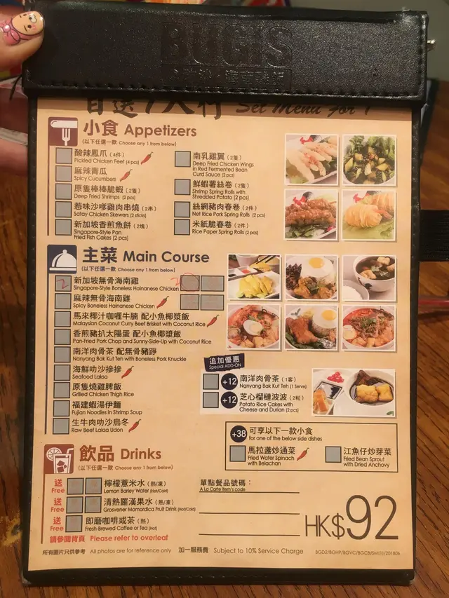 速食既我地都冇咩點睇到MENU, 人人直接黎個自選1人行算數, 都OK AR $92蚊有主菜+小食+飲品, 主菜有9款, 我地3個人叫左2個新加坡無骨海南雞配油飯同埋一個海鮮叻沙摻摻, 小食都有9款可以揀, 我地揀左原隻棒棒脆蝦, 惹味沙嗲雞肉串燒同埋絲綢豬肉春卷。