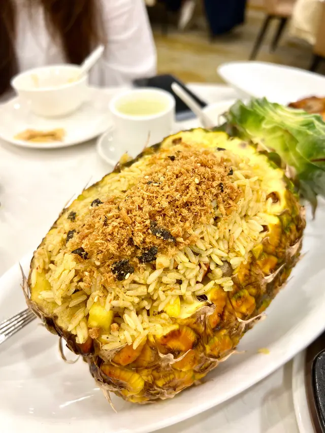 原隻菠蘿🍍上,炒飯口感濕潤軟糯,內有提子🍇乾同菠蘿粒。