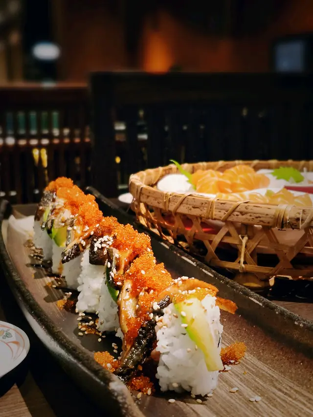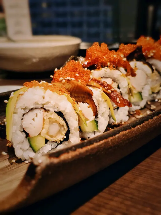一份約有8件壽司 內餡係天婦羅炸蝦/蟹柳/青瓜 表面蓋上薄片牛油果/ 鰻魚同海量蟹籽 口感豐富