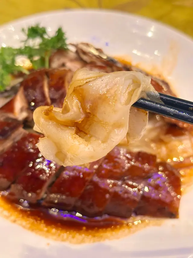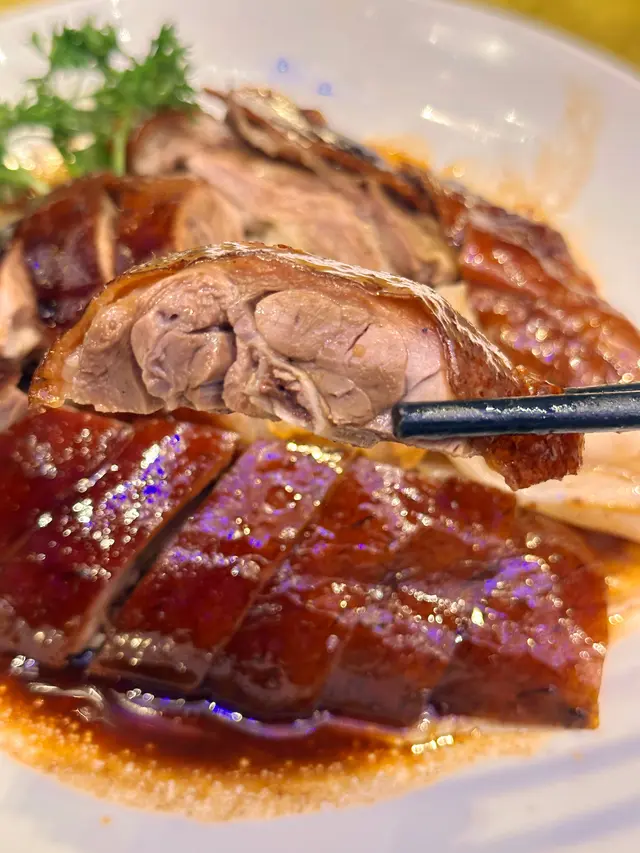 遠年陳皮燒鵝伴陳村粉 : 燒鵝燒到外皮香脆,肉嫩多汁,底層陳村粉吸收曬滷水汁及鵝油嘅精華,非常美味