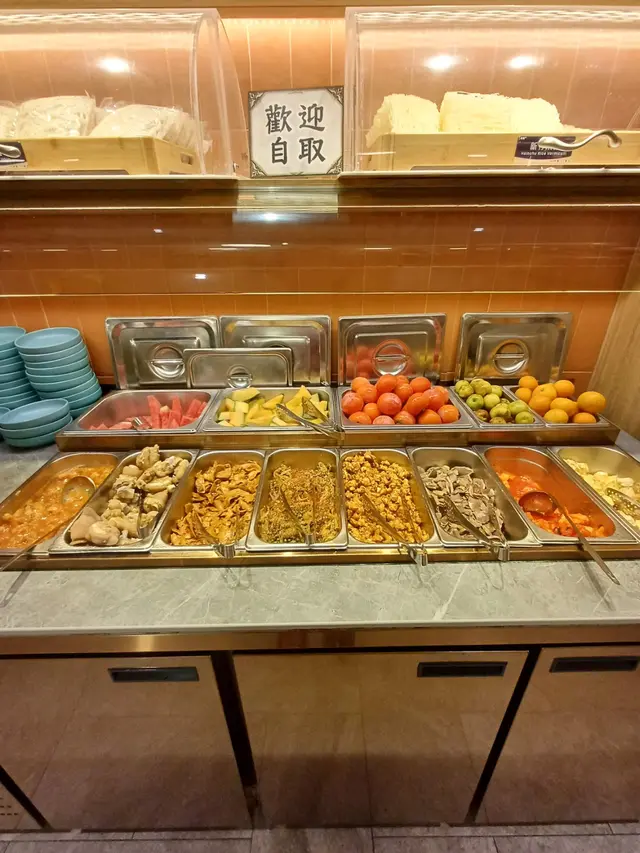 自助區琳琅滿目,水果、甜品、飲品、蔬菜、菌菇等一應俱全。