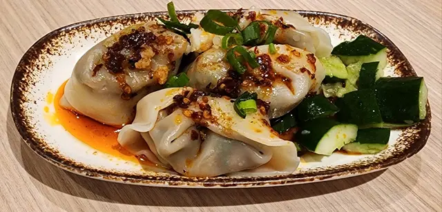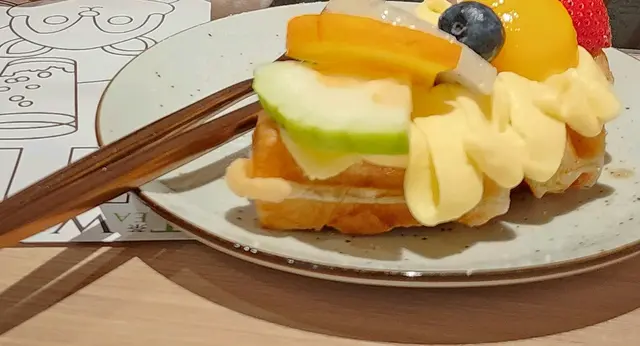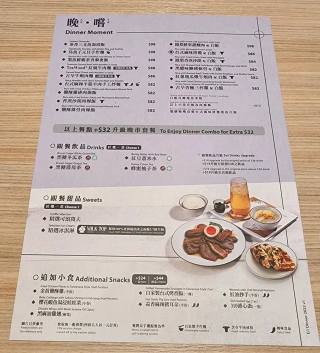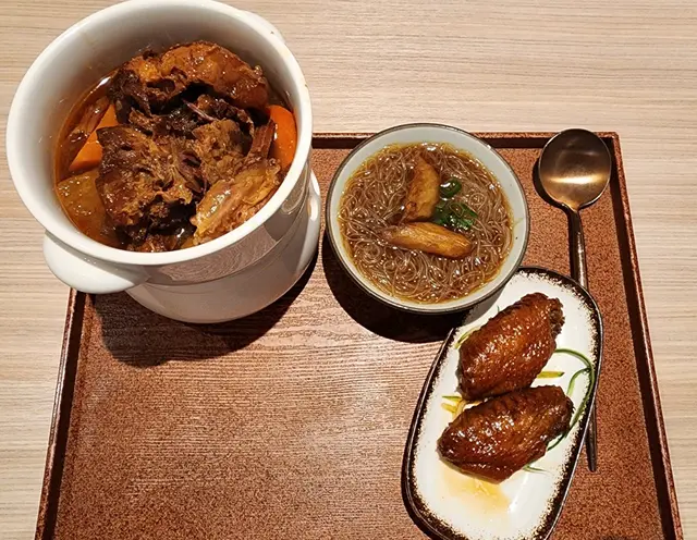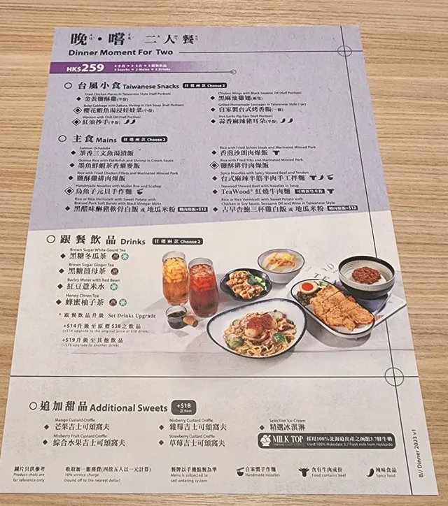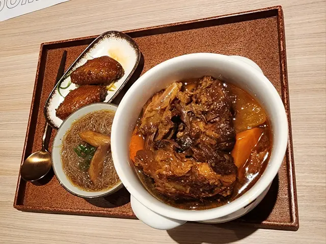 「黑醋味醂豬軟骨配地瓜米粉」,「櫻花蝦魚湯浸娃娃茶」,「紅油抄手」,「黑麻油雞翅」,黑糖薑母茶,蜂蜜柚子茶,脆脆黑糖奶茶,連一份「綜合水果吉土可頌窩夫」。這頓晚餐頗為豐富。