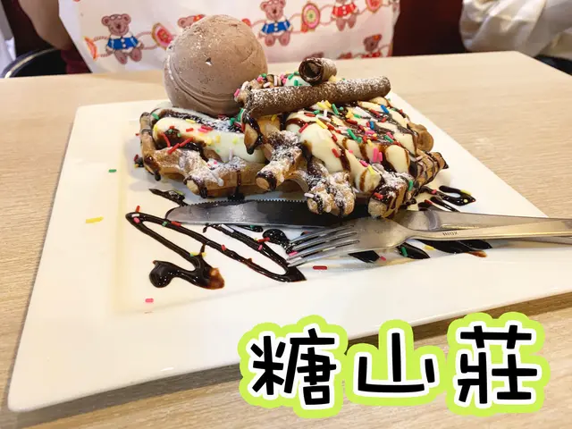 🍨講返呢間甜啊舖,佢就叫做#糖山莊 ,喺正安定輕鐵站對面,都幾易搵到;佢哋賣嘅都係一般嘅甜品為主,P仔同朋友就叫咗佢甜奶朱古力醬窩夫同抹茶心太軟share。