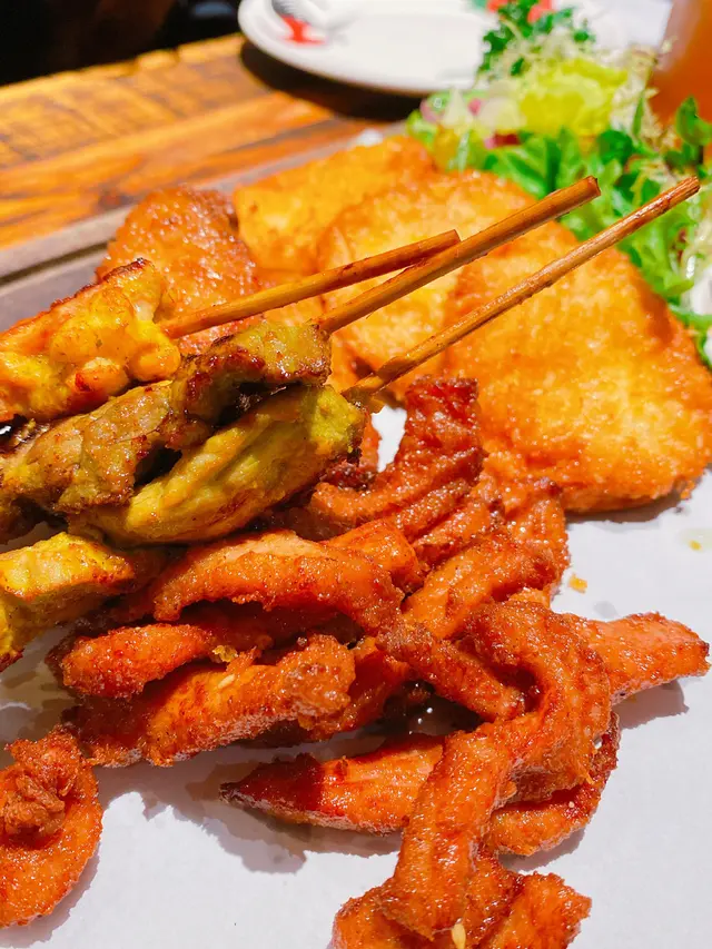 有蝦餅、雞翼、豬頸肉、沙爹串燒