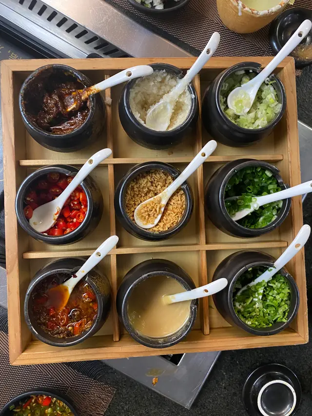 先來個九宮格醬料,醬料都款式幾多,有辣椒、沙嗲、蒜蓉、蔥等等。