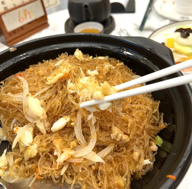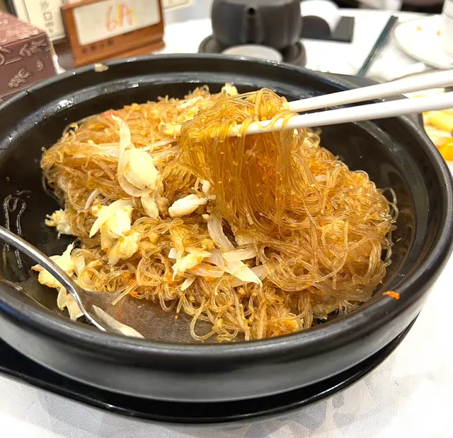 乾逼拆蟹肉粉絲煲 ~ 用瓦鍋盛載, 保持溫度. 蟹肉蟹籽有份量, 好吸睛.