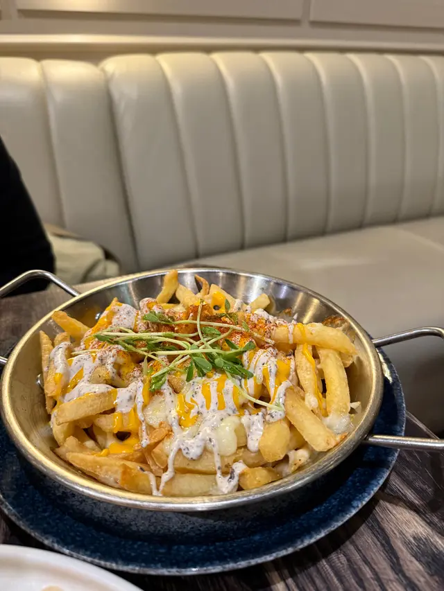 薯條一大盤上,上面有溶咗嘅碎芝士同埋黑松露蛋黃醬,呢個組合無得輸呀,仲可以拉絲添!