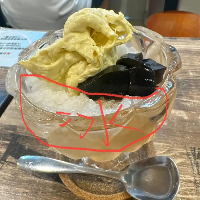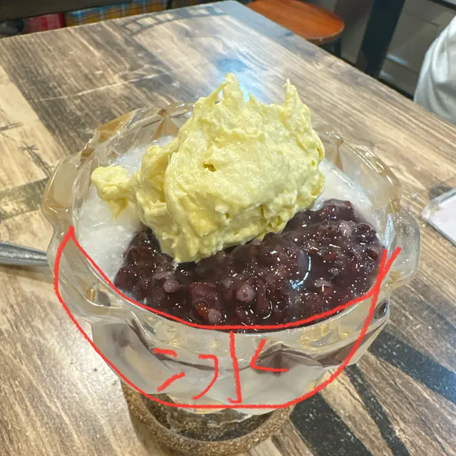 首先碗嘢已經唔大碗,大概平時嘅細飯碗,面頭有一pat榴連蓉,首先榴槤蓉係好食嘅。我叫椰果配涼粉,朋友係椰果配紫糯米。食面頭嗰浸都仲係滿意嘅,到食完面頭啲料就發現下面個底全部都係冰,原來配料只有面頭可見嗰幾啖🫠啲冰仲要唔係綿綿冰好碎嗰種,明顯佢係用普通刨冰機刨,有好多冰都仲好大粒,係會咬到「確確」聲嗰種,最後食晒面頭浸嘢就放棄咗,同朋友食完真心有衝動去第二間再食過,真心未試過食甜品食完想去下場再食,仲都唔平,兩杯嘢埋單$94