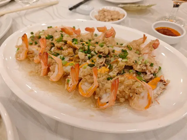 蒜蓉粉絲蒸開邊大海花蝦, 八隻中蝦伴以大量蒜蓉粉絲開邊蒸, 上桌時熱氣騰騰, 蝦肉爽口彈牙,有水準😋