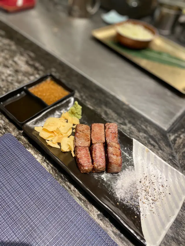一向中意食和牛,入口即溶,可以點蘋果加蒜汁或柚子汁,我就中意將獨子蒜薯片加wasabi同岩鹽一啖食。