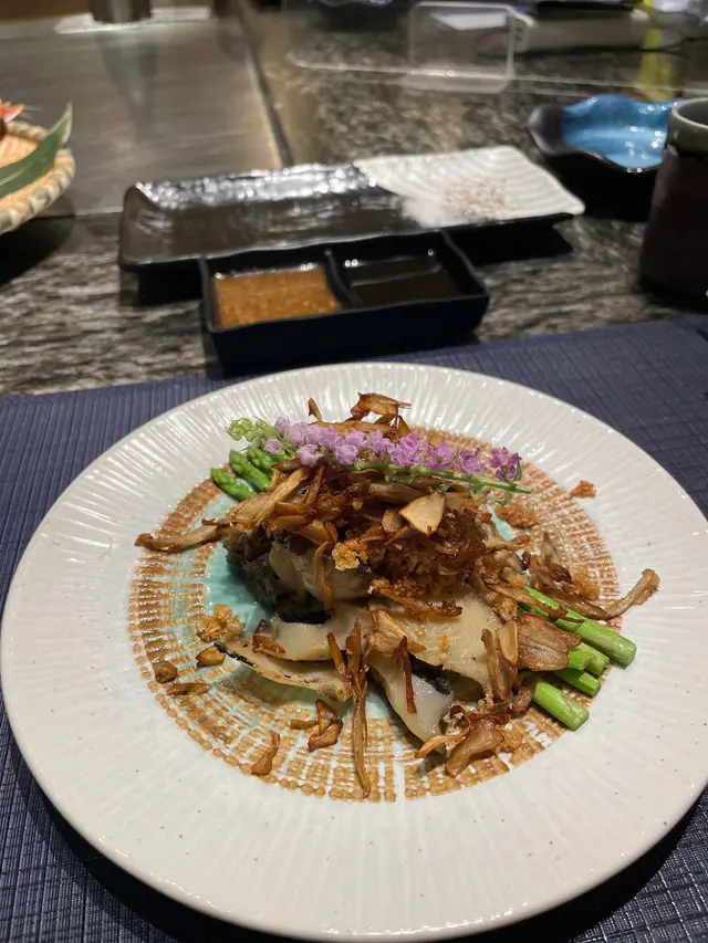 鐵板燒成日食銀鱈魚,旭用左本地無骨馬友,經事前醃製,用左一夜干做法,煎一邊肉,然後蒸。毋須落調味,加點柚子酸汁加青檸汁調配就非常香口。食完可以食埋旁邊既龍珠果去油膩。