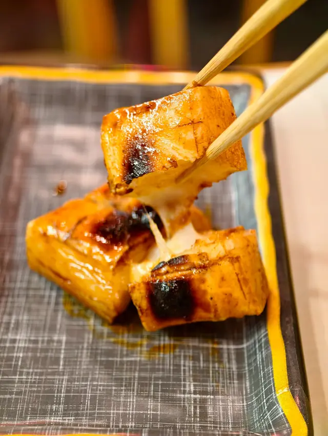 表面焦香的煙肉包裹住軟糯的年糕,味道鹹香。