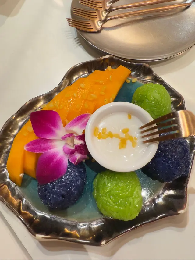 甜品梗係食芒果糯米飯啦,芒果糯米飯加咗斑斕同埋蝶豆花,顏色靚,真係好睇又好食。