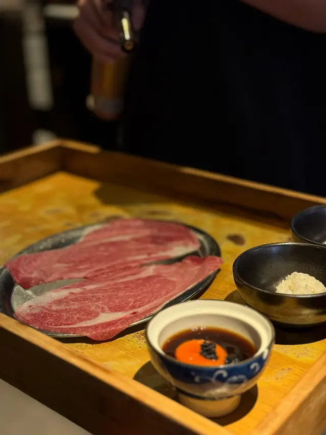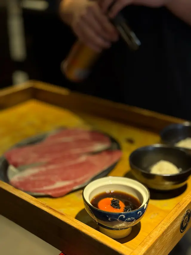 店員喺我地面前用火槍將和牛片炙燒, 同傳統擺入鍋仔入邊煮嘅方式唔同. 而且個蛋汁加埋黑松露, 燒肉會吸晒醬汁, 肉質嫩滑, 最後擺入碗飯度味道超級夾🙂↕️